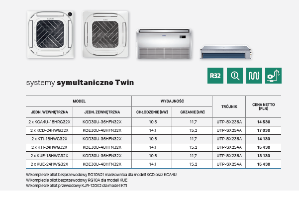 System symultaniczny TWIN pozwala podłączyć dwie jednostki wewnętrzne tego samego typu oraz mocy do jednego agregatu (jednostki zewnętrznej). Rozwiązanie to pozwala poprawić dystrybucję powietrza w klimatyzowanych pomieszczeniach oraz zapewnia oszczędność miejsca montażu poprzez instalację tylko jednej jednostki zewnętrznej. System ten idealnie sprawdza się w klimatyzacji dużych pomieszczeń takich jak sale konferencyjne i bankietowe, biura typu open space, restauracje i inne obiekty usługowohandlowe. W systemie twin jedna jednostka wewnętrzna musi być ustawiona jako master, a druga jako slave. Tylko jednostka nadrzędna może przyjąć sygnał sterujący z pilota, jednostka podrzędna wykonuje jedynie ustawienia jednostki nadrzędnej.